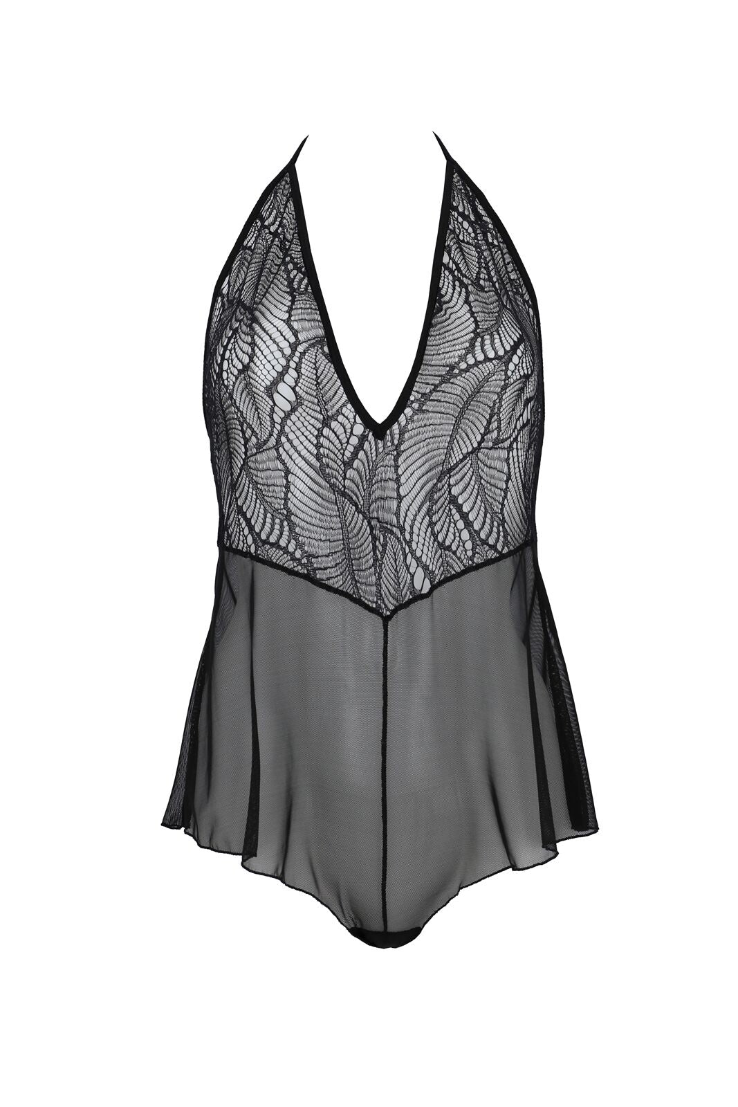 Верхня частина боди виготовлена з найтоншого, м'якого мережива, прикрашеного витонченим рослинним орнаментом у вигляді листя. Груди делікатно прикриті двома трикутними вставками, що формують глибокий V-подібний виріз, який майже досягає талії, створюючи привабливий та спокусливий силует. Нижня частина виконана у вигляді вільних шортиків з легкої, струмливої сітчастої тканини, що додає образу повітряності та невагомості.