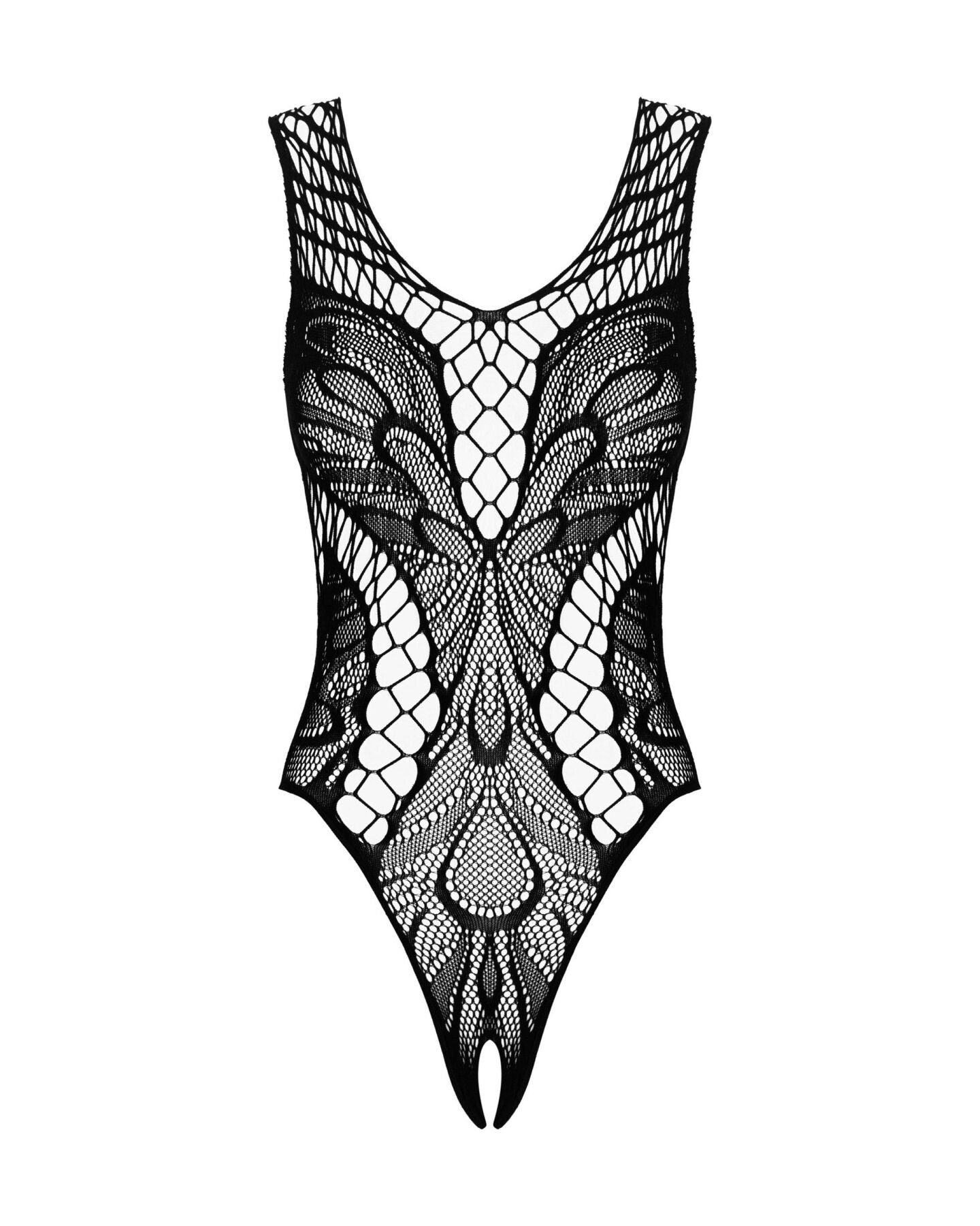 Через витончений малюнок чітко проглядається тіло: контури грудей з сосками та ореолами, западина пупка та спокуслива попка. Відкрита спина виглядає неймовірно привабливо. А отвір на промежині обіцяє дуже палку ніч з можливістю насолодитися партнером, не знімаючи це чудове боді, що додає пікантності та зручності.