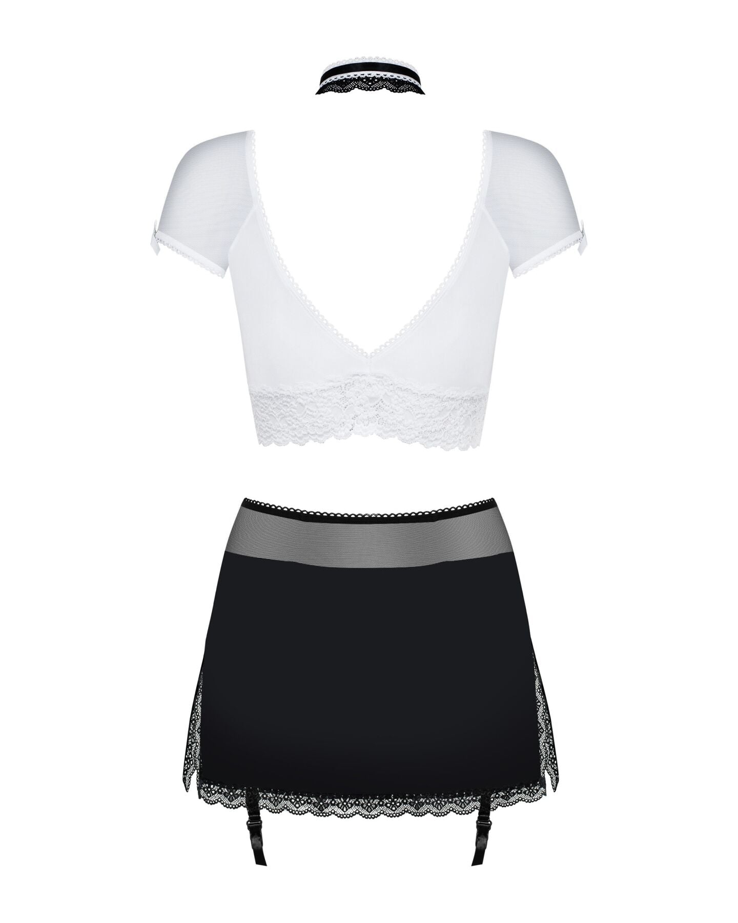 Еротичний комплект "Секретарка" Obsessive Secretary suit 5pcs виготовлений з ніжного мультистретч матеріалу, який гарно облягає тіло, підкреслюючи його форми. Білий топ з короткими рукавами оздоблений мереживом внизу. V-подібний виріз спереду та відкрита спина ззаду демонструють гладку шкіру. Перехрещені чашки ліфа надійно підтримують груди і вигідно їх підкреслюють. Чорно-білий комір-чокер з атласним бантиком додає нотку екстравагантності. Коротка спідниця з великими розрізами відкриває довгі ніжки та обіцяє цікаві можливості під час сексуальної гри. Мереживні оборки спідниці створюють атмосферу грайливості. Комплект доповнюють маленькі стрінги зі знімними підв’язками, завершуючи спокусливий образ.