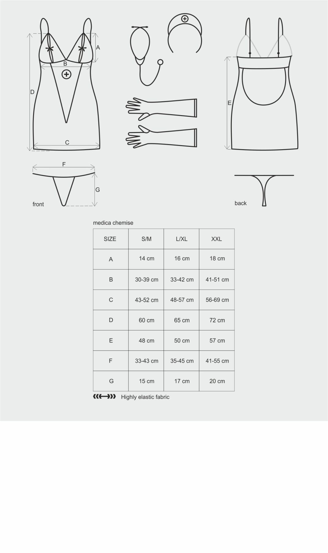 Сорочка цього приголомшливого костюма виготовлена з білого мереживного матеріалу. Великі квіти та милі завитки елегантно прикривають оголене тіло, контрастуючи з кольором шкіри. Кожна трикутна чаша ліфа складається з двох частин — мереживної та сітчастої, через які видно сосок та ореолу. Грайливий червоний бантик, що можна розв’язати, привертає увагу до цієї пікантної деталі. Регульовані бретелі забезпечують ідеальну посадку сорочки. Клиноподібна деталь з дрібної сітки вшита спереду, красиво лягає на живіт, вказуючи на ніжне, спрагле лоно. Відкрита спина і маленькі стрінги виглядають вражаюче. Мереживні рукавички щільно облягають руку і є цікавим аксесуаром. Дотики пальців у рукавах до розпаленого тіла партнера можуть бути неймовірно збуджуючими. Якщо включити фантазію та провести огляд його та своїх найінтимніших місць, ця ніч залишиться в пам'яті вашого коханого надовго. Стетоскоп і медсестринська шапочка чудово доповнюють образ.