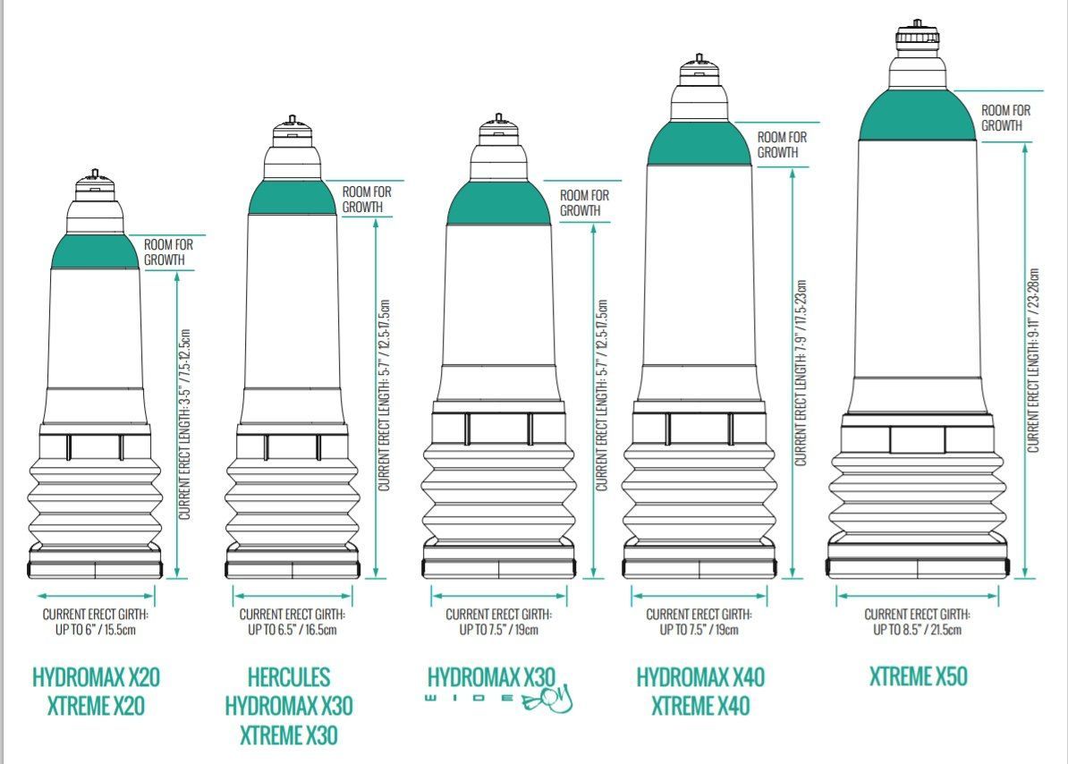 Тепер у колекції Bathmate є гідропомпи, що підходять для всіх розмірів членів: маленькі Hydromax 5, середні Hydromax 7, великі Hydromax 9, екстра великі HYDROXTREME 11, а також нова модель - HYDROMAX 7 Wide Boy, яка має середню довжину і великий діаметр.
