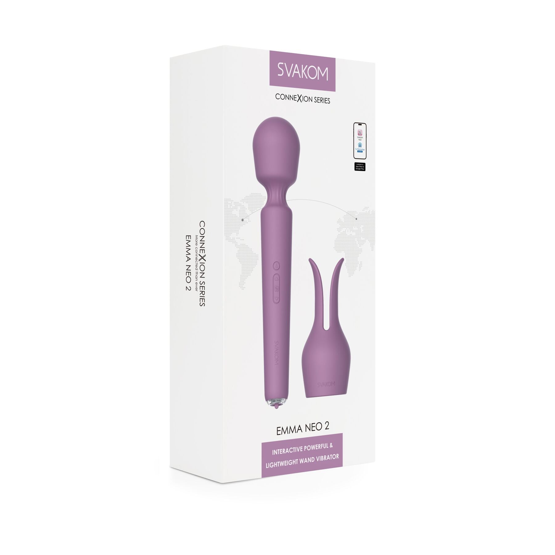Пропонуємо вам придбати інтерактивний вібромасажер із функцією підігріву Svakom Emma Neo 2 — вдосконалену версію популярного вібратора Emma Neo. Ця модель має ще більшу потужність, покращену зручність і новий інтелектуальний режим, що дозволить вам насолоджуватися новими відчуттями! Новий дизайн класичного ванд-масажера забезпечує комфортний масаж різних частин тіла та стимуляцію улюблених ерогенних зон. Підігрів до 38 °C, 5 режимів вібрації з можливістю регулювання інтенсивності (по 5 для кожного режиму), а також знімна гнучка головка відкриють перед вами нові горизонти еротичних насолод. Унікальне LED-підсвічування створює атмосферу: яскравість індикатора зростає з інтенсивністю вібрації! Ви можете керувати вібромасажером через смартфон, передавати управління на відстані, створювати власні режими в додатку та багато іншого.
