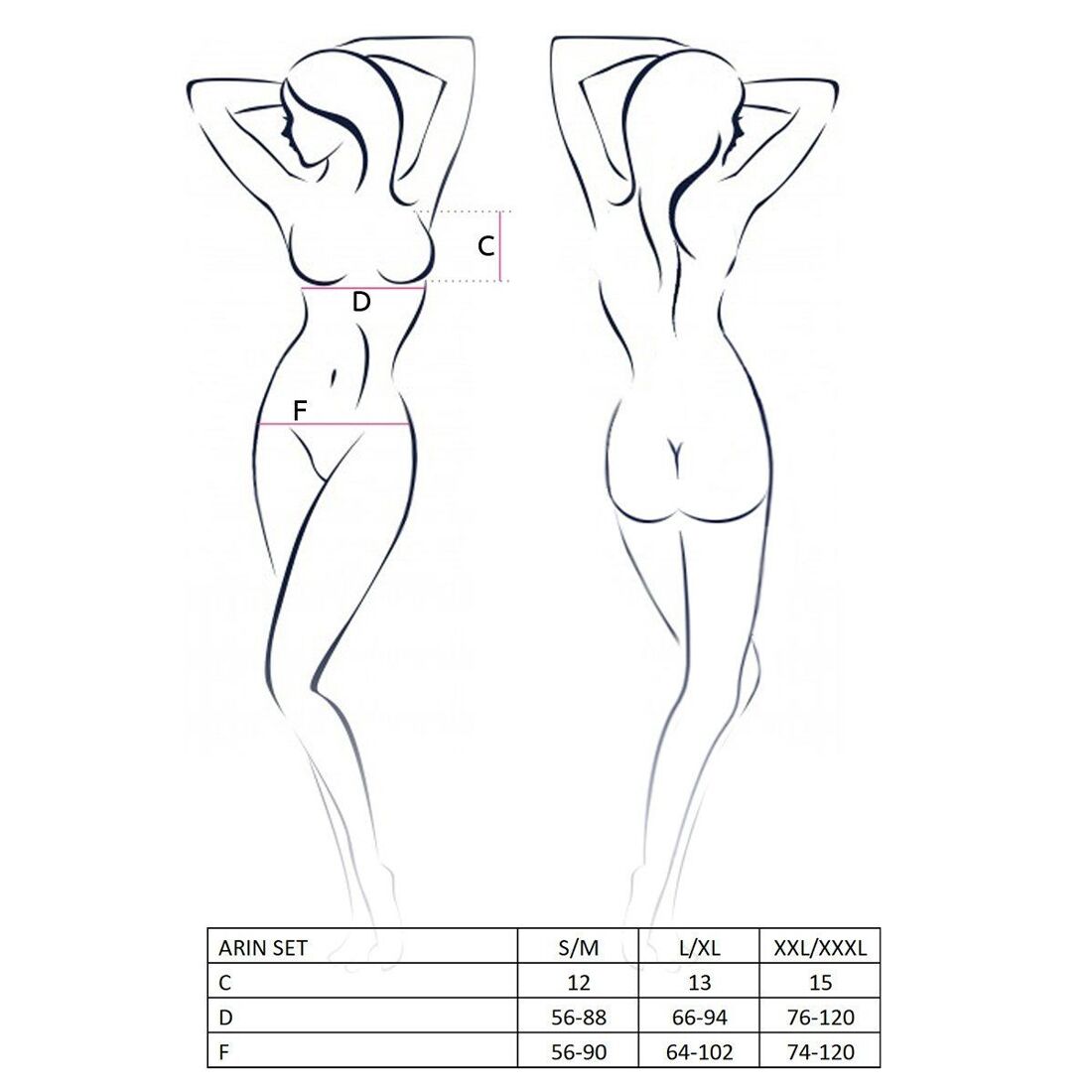 Для всіх шанувальниць новітніх модних напрямків пропонуємо придбати комплект білизни ARIN SET black S/M - Passion Exclusive. Велика сітка разом з широкими плоскими гумками з написами є справжнім трендом цього сезону! Трусики з високою посадкою і топ з оригінальною спинкою забезпечують зручність під час носіння.