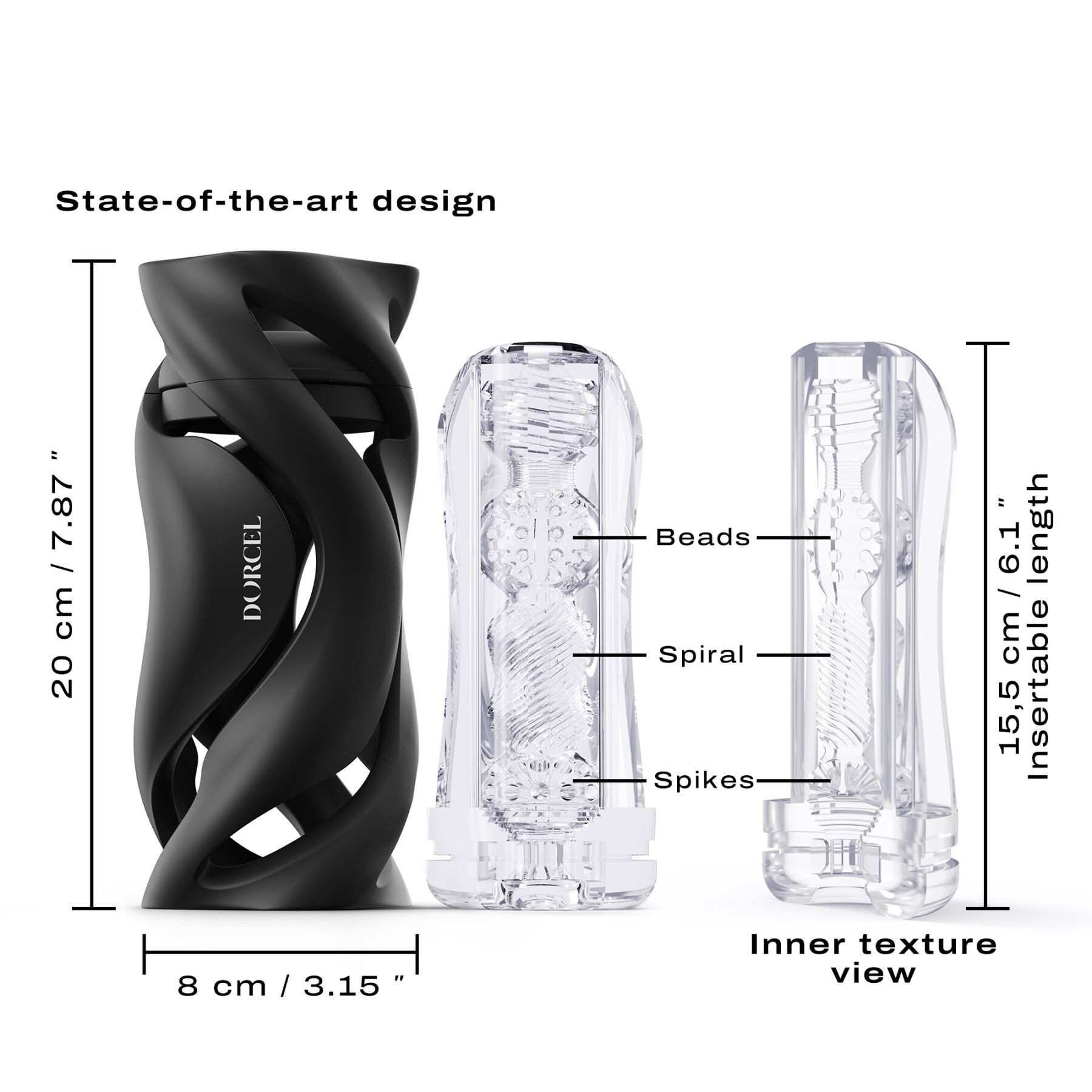 декілька зон стимуляції всередині рукава: ваш член зустрічають ніжні опуклості, у середині його фантастично охоплюють спіралі, потім щільні перлини стимулюють кожну чутливу точку, а у фіналі канал звужується для супер'яскравих відчуттів;
