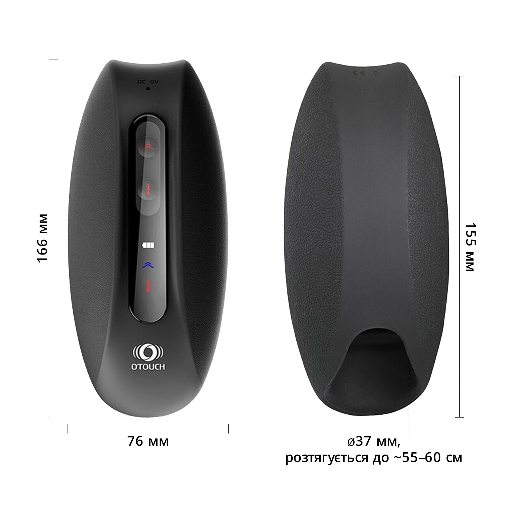 універсальні розміри: внутрішній діаметр каналу 3,7 см, розтягується до 5,5–6 см, довжина каналу 15,5 см (разом із напіввідкритою зоною);
