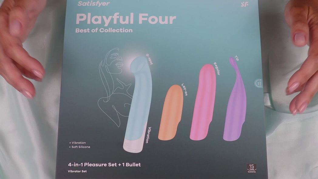 Ви з тих людей, хто просто не може визначитися? Або вам просто потрібна постійна різноманітність? З Satisfyer Playful Four ви отримаєте чотири можливості для вашого соло-часу в одному наборі. Невеликий буліт з кнопкою служить як контрольна база, а чотири змінні насадки з м'якого, приємного для шкіри силікону легко міняються. Так ви можете навіть у особливо дикі моменти передумати та перемикатися між «коханцями».