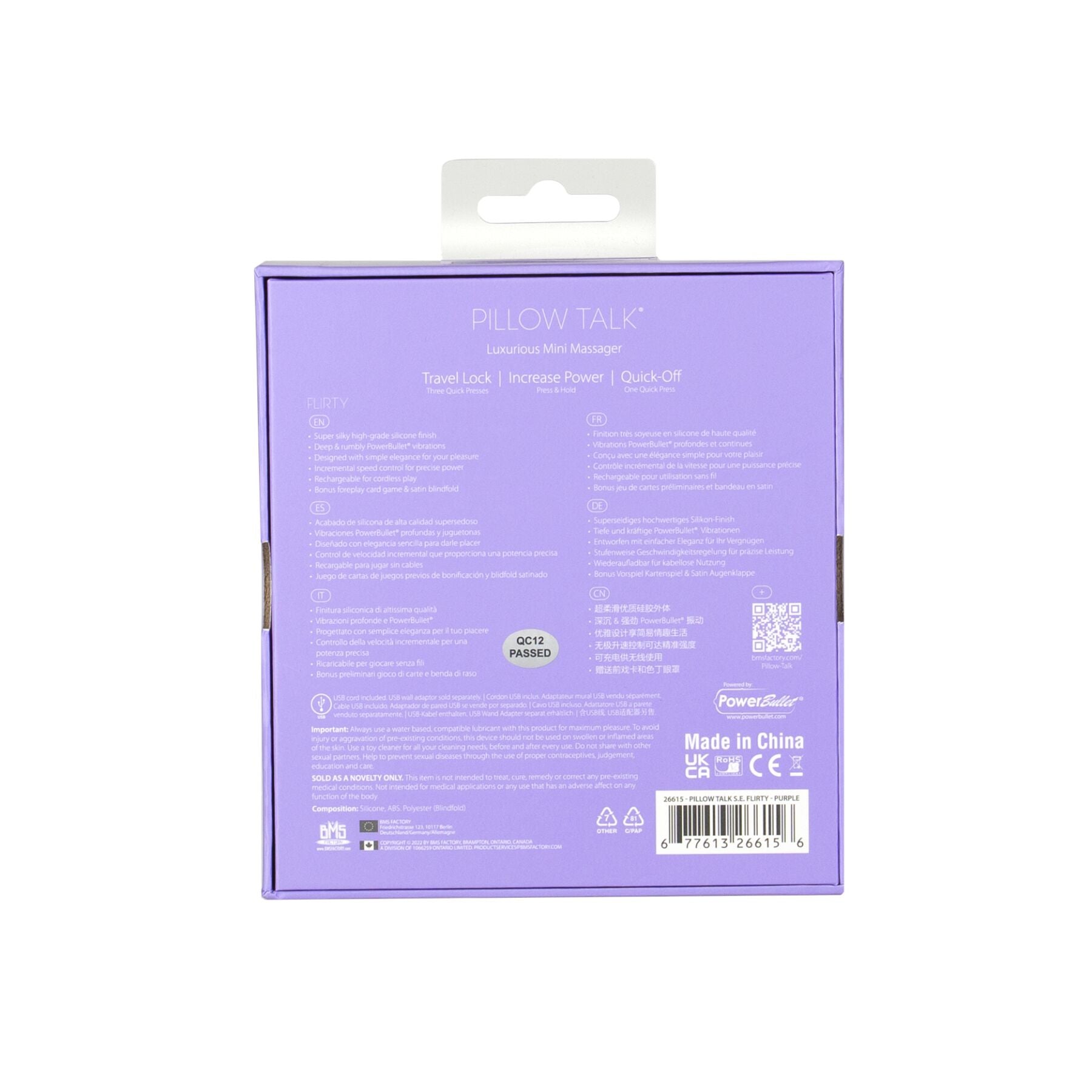 Кожна деталь розкішного вібратора Pillow Talk Special Edition Flirty була розроблена з урахуванням потреб і бажань жінок, тому він є втіленням досконалості серед мінівібраторів. Поставляється в елегантній щільній коробці з оглядовим віконцем, що може слугувати подарунковою упаковкою.