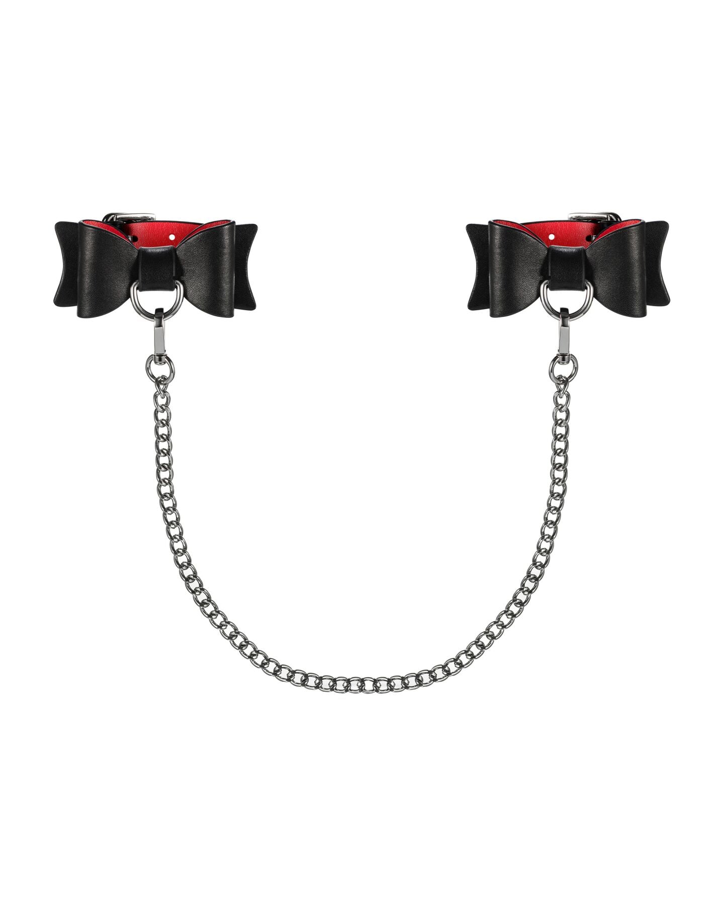 Ці шкіряні наручники-банти з довгим ланцюгом Obsessive A745 виготовлені з м’яких матеріалів, що забезпечують комфортну та безпечну посадку на зап’ястях. Ремені наручників можна регулювати, що робить їх підходящими для будь-якого розміру зап’ястя. М’які банти зі штучної шкіри надають образу грайливості, а червоний виворот підкреслює зухвалість і сексуальну впевненість дівчини. Довгий ланцюг, що кріпиться до бантиків за допомогою карабінів, забезпечує свободу рухів. Але, якщо включити фантазію, ці наручники можуть стати елементом сексуальної гри для зв’язування, контролю та інших пікантних задоволень. Наручники можна поєднувати з іншими аксесуарами: повідками, масками, шльопалками.