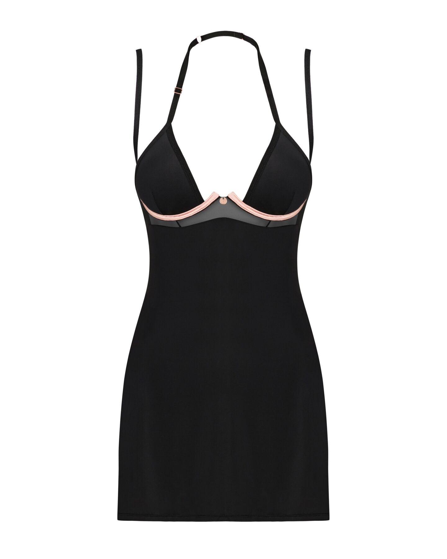Сорочка від Obsessive виготовлена з щільного чорного матеріалу, який вдало підкреслює вашу фігуру. Основна особливість моделі – елегантний дизайн бюста. Чашка частково відкрита з боків, має рожеві кісточки, що забезпечують відмінну підтримку завдяки регульованим бретелям та багатоступеневій застібці на спині. Маленька підвіска з рожевого золота з логотипом бренду додає вишуканості. Сорочка комплектується стрінгами з низькою посадкою.
