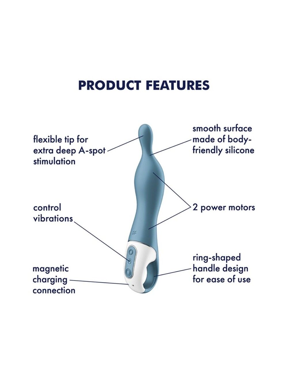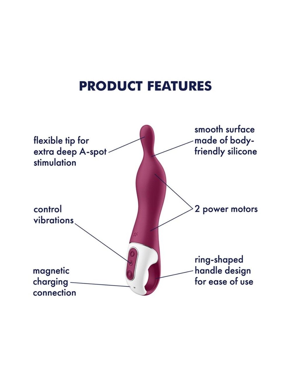 Унікальний дизайн цього вібратора призначений для стимуляції точки A — скупчення нервових закінчень, розташованих глибоко на передній стінці піхви. Вплив на цю зону сприяє швидкому збудженню та особливо яскравим оргазмам! Вібратор для точки A Satisfyer A-Mazing 1 — це: