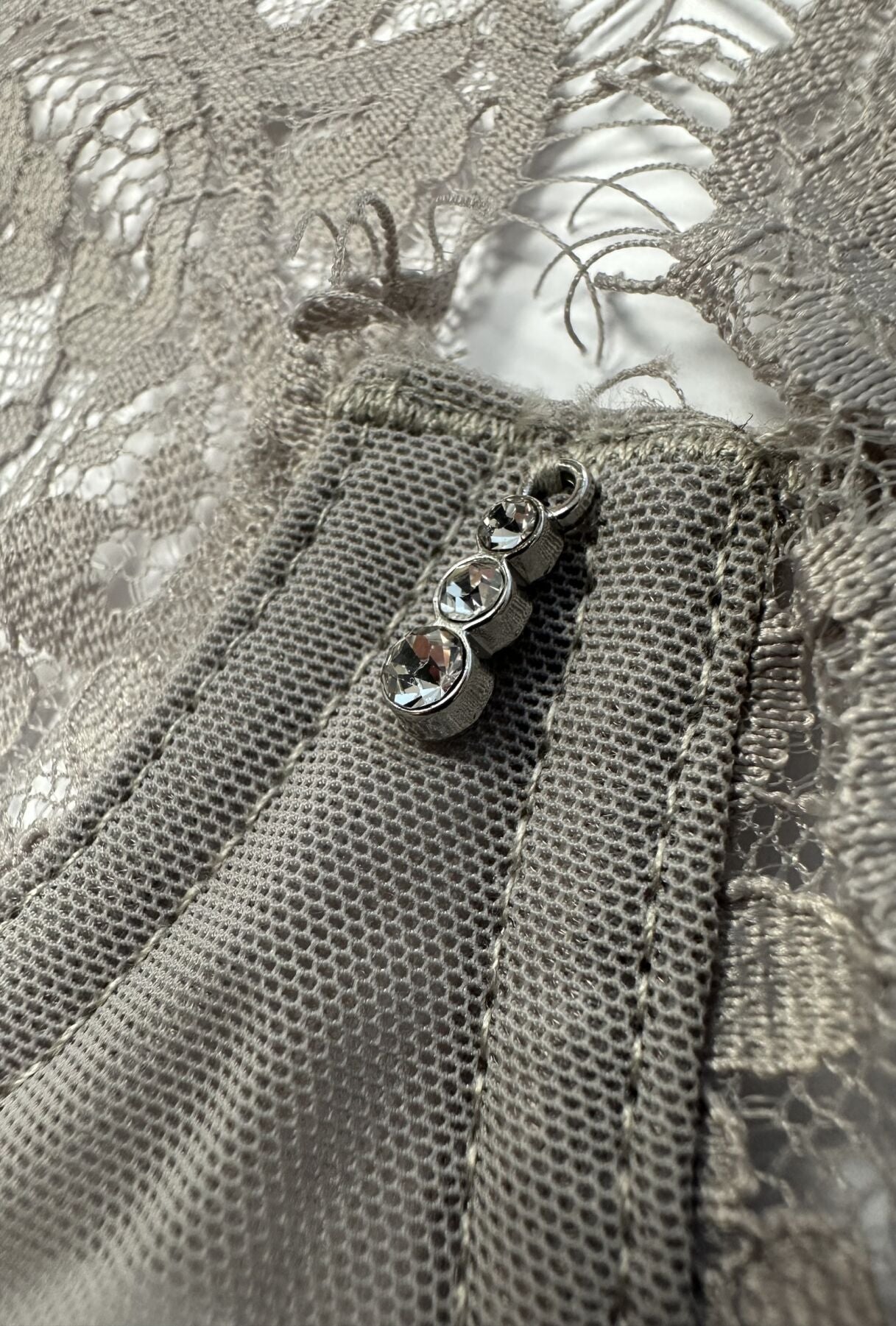 Чашечки с косточками обеспечивают деликатную поддержку и формируют аккуратный, выразительный силуэт. Тщательно подобранное сочетание тканей дарит ощущение лёгкости и комфорта, а тонкие кружевные вставки по линии бёдер привлекают внимание и создают гармоничный баланс между прозрачностью и деталями.