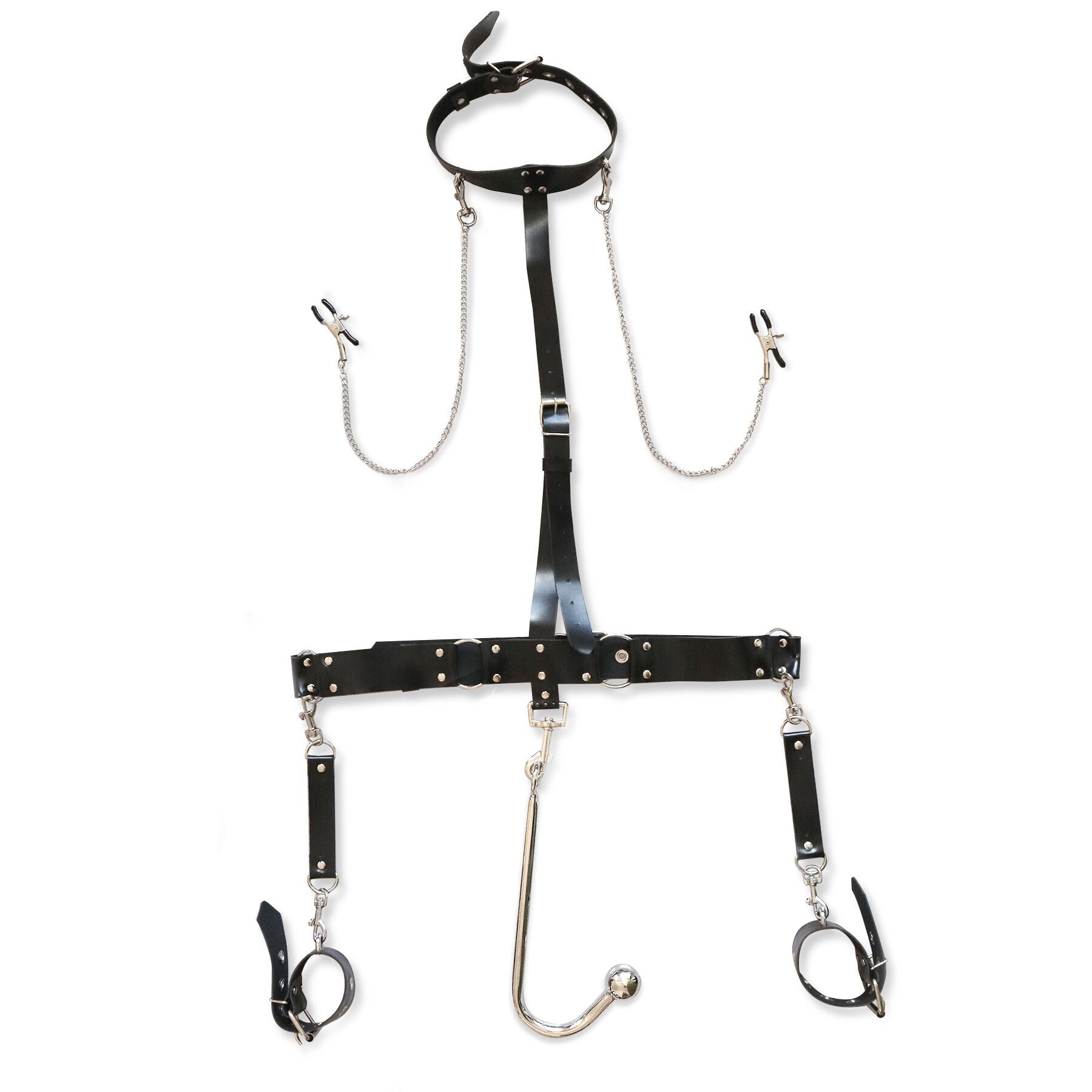 Это уникальное устройство предназначено для любителей БДСМ. Бондажный комплект Bridget изготовлен из надежного металла и натуральной кожи. Благодаря кожаному поясу и анальному крюку, вы сможете легко практиковать подвешивание с использованием веревок для шибари, а нашийник, наручники и зажимы для сосков значительно усилят ощущения от стимуляции. Это настоящее уникальное устройство, которое объединяет элементы нескольких различных БДСМ-практик. Ощутите необычное сочетание эмоций и насладитесь интенсивной и глубокой стимуляцией эрогенных зон после использования этого девайса.