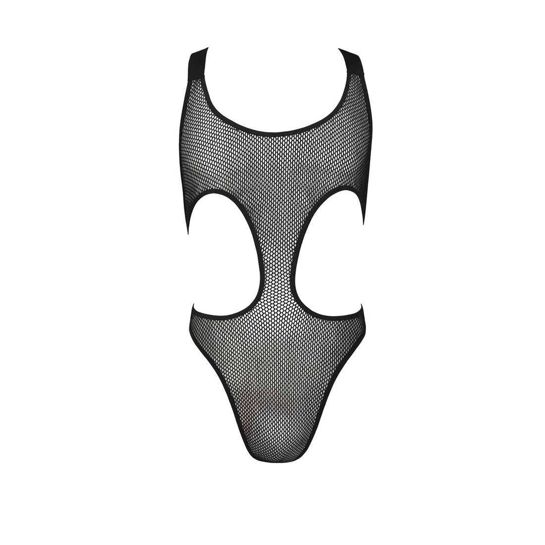 Боді Passion Leon изготовлено из крупной сетки спереди и широких резинок сзади, которые перекрещиваются, оставляя ягодицы открытыми. Спереди есть два больших выреза по бокам, а ткань великолепно облегает все изгибы тела благодаря резинкам.