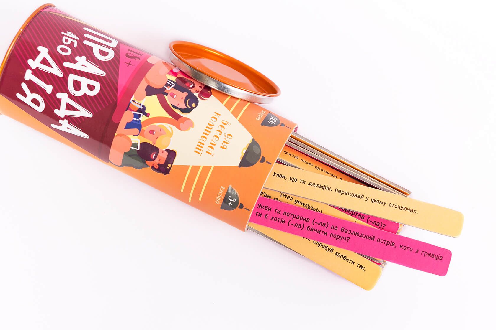 Выбрав "Правду", вам нужно будет искренне ответить на один из хитроумных вопросов. Выбрав "Действие", вам следует выполнить задание, которое будет на белой стороне стика. Но не волнуйтесь, все продумано так, чтобы всем было весело. Попробуйте!