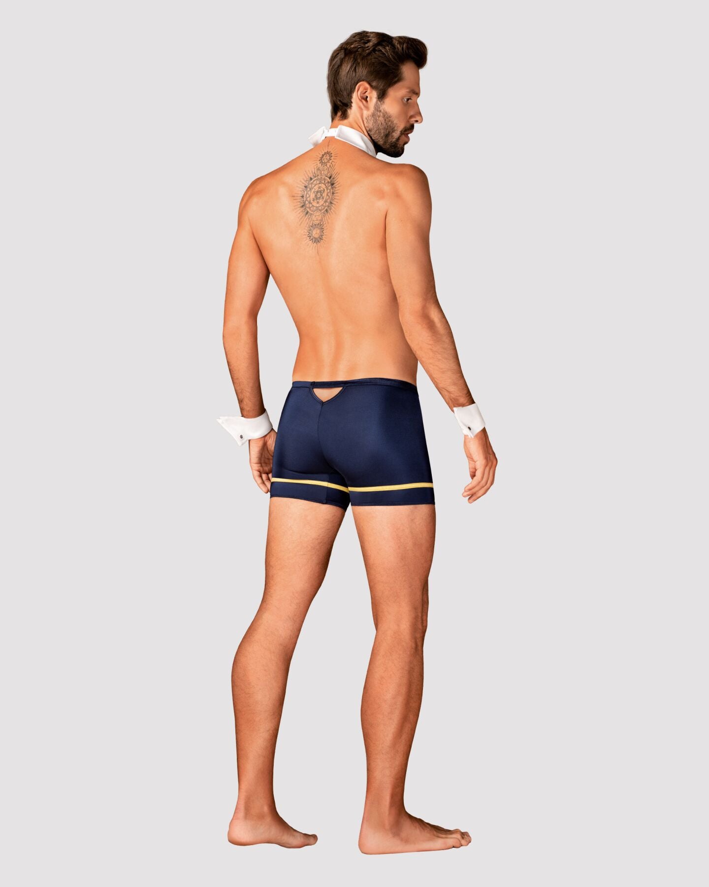 Костюм пилота с очками Obsessive Pilotman set изготовлен из мягкого, приятного на ощупь эластичного материала. Боксеры элегантно облегают бедра, подчеркивая формы и интимные части. Синяя ткань с золотистыми акцентами и логотипом, напоминающим крылья, вызывает ассоциации с романтикой полетов, а вырез на спине добавляет интриги и эротичности. Воротник с галстуком и манжеты придают образу особый шарм. Воротник удобно застегивается на пуговицы, манжеты — на кнопки. Стильные очки завершают вид отважного пилота.