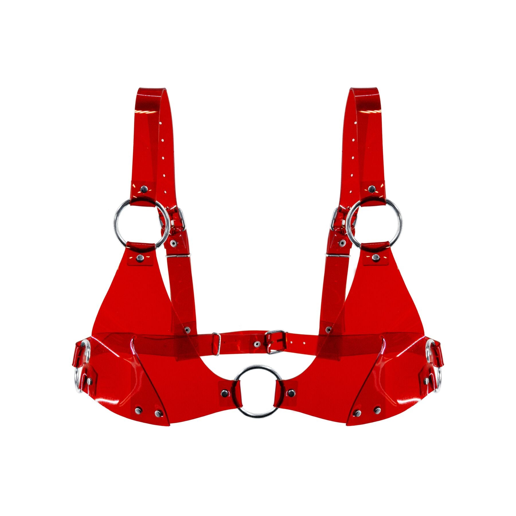 Этот очаровательный и смелый прозрачный топ с чашками — уникальное сочетание стиля и комфорта. Его провокационный красный оттенок и блестящая лакированная поверхность сразу привлекают внимание, делая топ идеальным выбором как для BDSM-образов, так и для рейв-вечеринок.