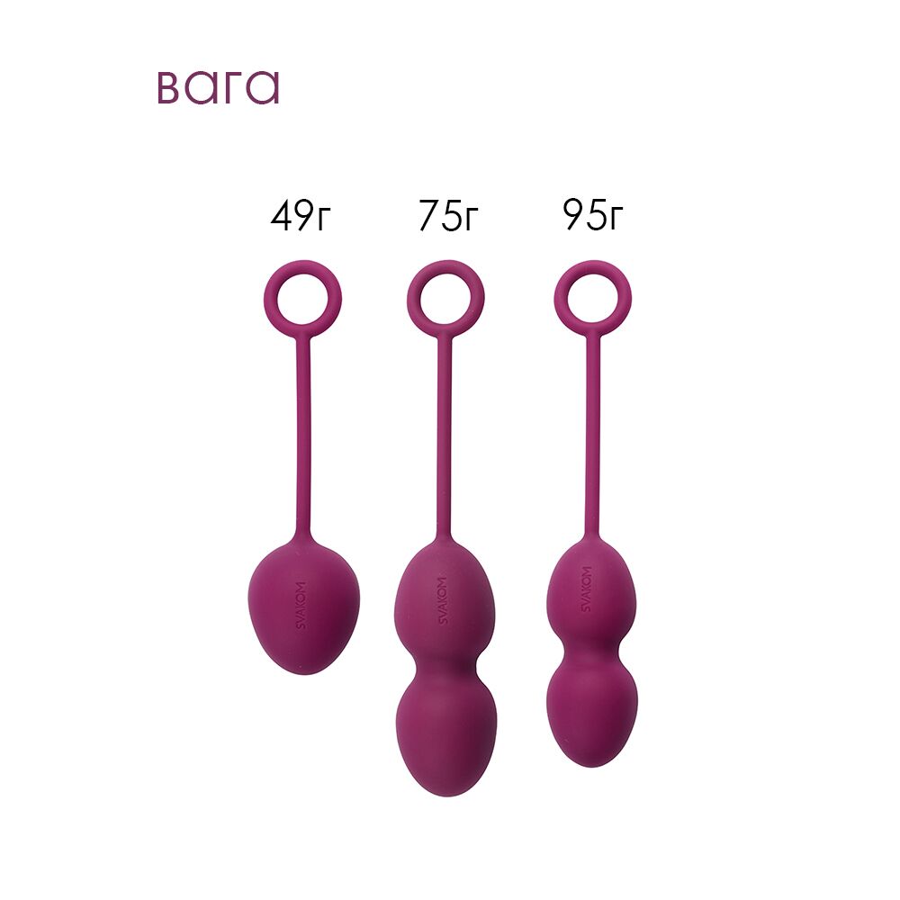 Предлагаем вам приобрести набор вагинальных шариков со смещенным центром тяжести Svakom Nova Plum Violet – это уникальный интимный аксессуар, который поможет укрепить мышцы влагалища, улучшить упругость стенок влагалища, повысить удовольствие во время близости, а также поспособствует восстановлению после родов. Набор состоит из трех тренажеров различного диаметра и веса для постепенного обучения. Нестабильный центр тяжести – шарик, который движется внутри, повышает эффективность тренировок и приносит дополнительные приятные ощущения!