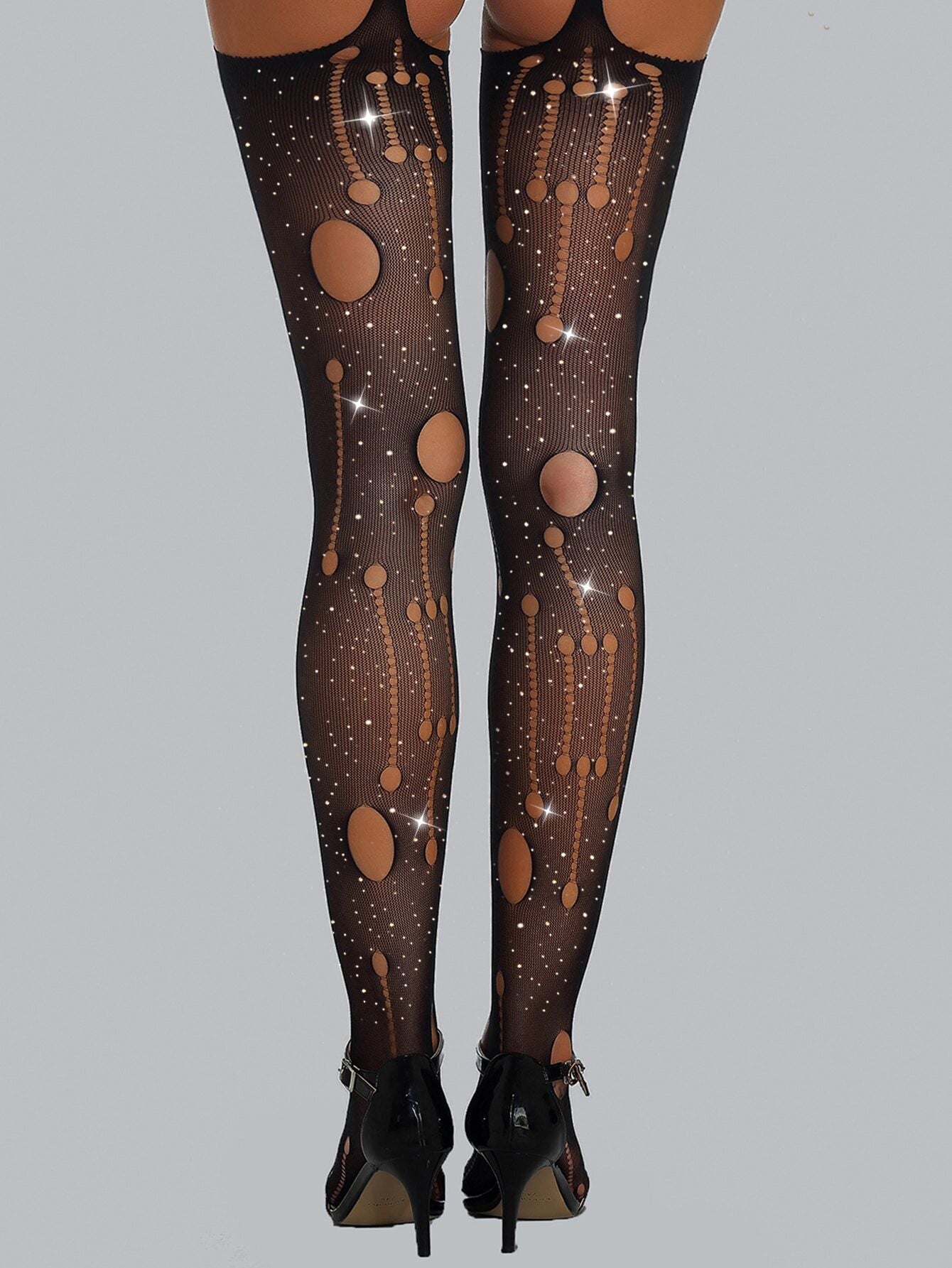 Особого шарма этим колготкам добавляют оригинальные "рваные" элементы, выполненные в виде аккуратных дырочек и стильных стрелок. А россыпь блестящих стразов, искусно расположенных на колготках, привлечет внимание к вашим соблазнительным ножкам, делая их главным акцентом вашего образа.