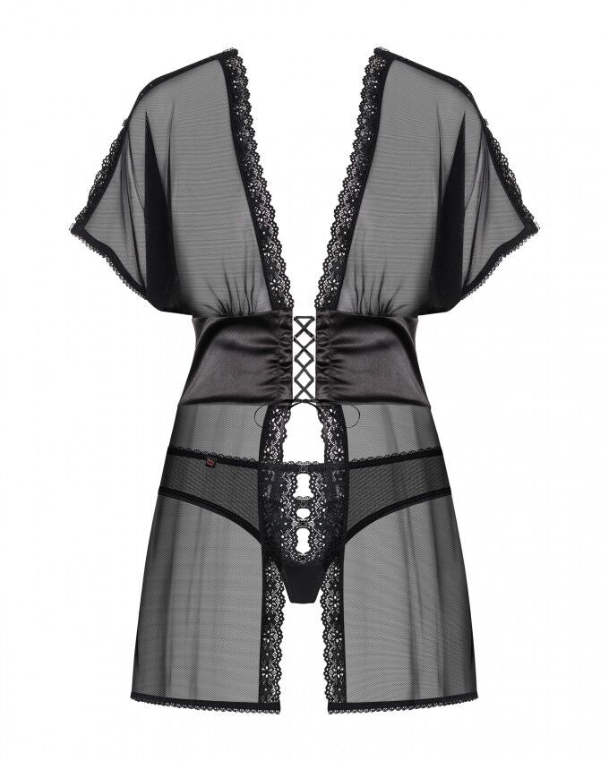 Пеньюар не будет сковывать ваших движений, ведь он легкий и воздушный, даря ощущение комфорта в течение всего вечера. Его украшает изысканная кружевная окантовка, короткие рукава и оригинальная имитация широкого пояса, который элегантно завязывается на шнуровку, подчеркивая вашу талию. Трусики имеют небольшие пикантные вырезы, что делает их вид оригинальным и соблазнительным, идеально дополняя пеньюар.