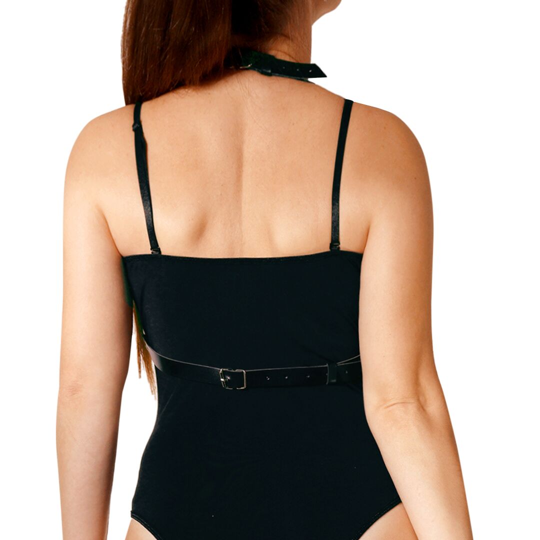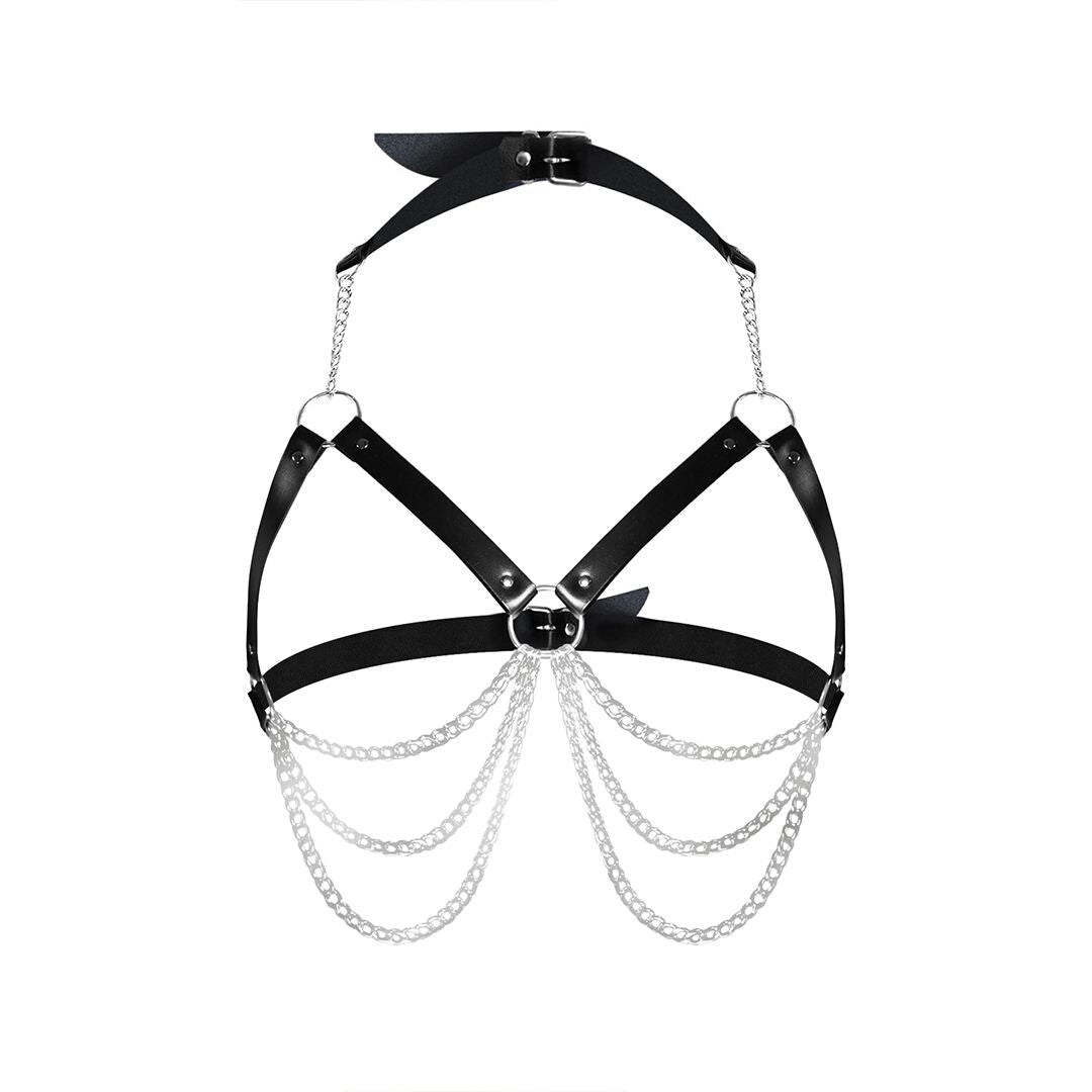 Портупея изготовлена из высококачественной искусственной кожи и представляет собой бюстгальтер без чашечек, дополненный изысканными металлическими цепочками. Расположенные снизу цепочки будут игриво покачиваться в ритм каждого вашего движения, украшая тело и привлекая внимание. Регулируемые ремешки обеспечивают комфортную посадку на любую фигуру.